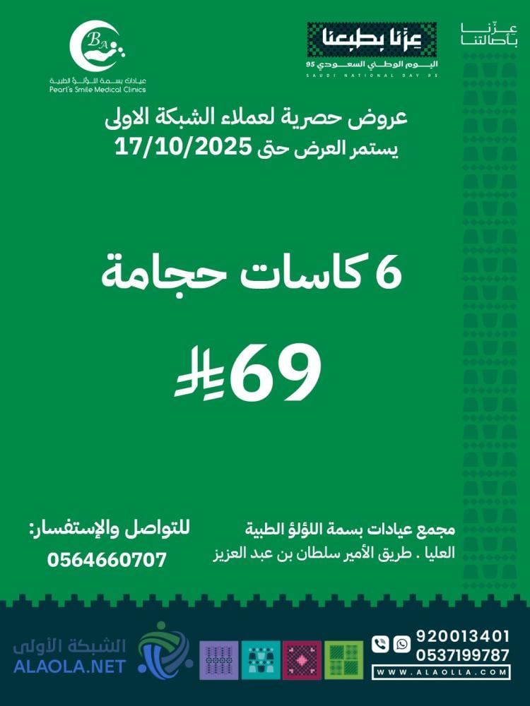 مزود الخدمات :مجمع عيادات بسمة اللؤلؤ الطبيةالعنوان :العليا . طريق الأمير سلطان بن عبد العزيزرقم الجوال :564660707
