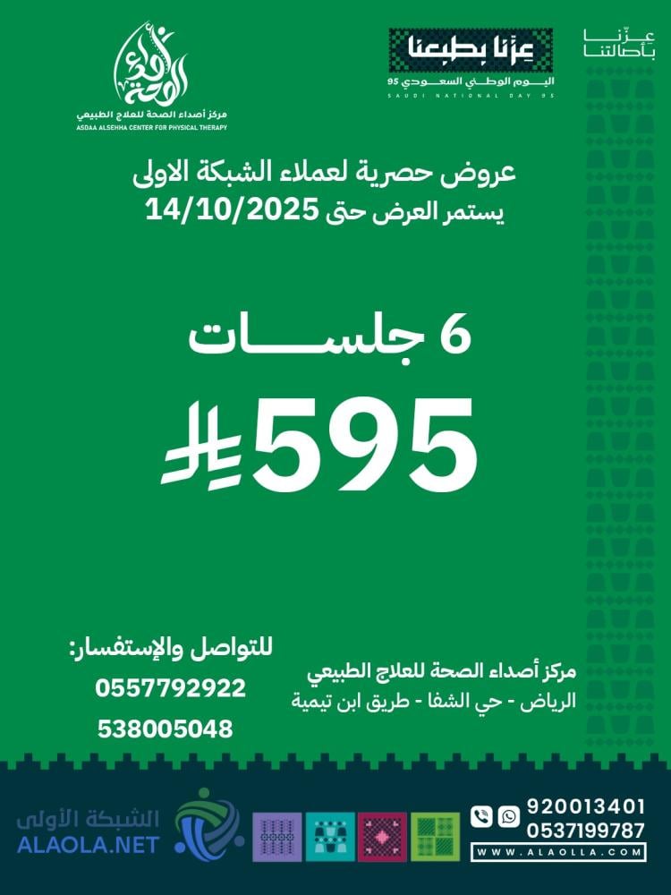 مزود الخدمات :مركز اصداء الصحة للعلاج الطبيعيالعنوان :الرياض - حي الشفاء - شارع ابن تيميةرقم الجوال :557792922